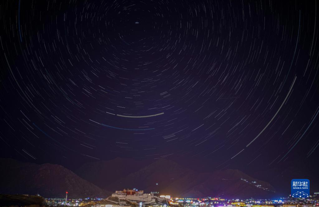 這是在拉薩市南山公園拍攝的以布達拉宮為前景的星軌照片(合成照片,11月21日攝)。