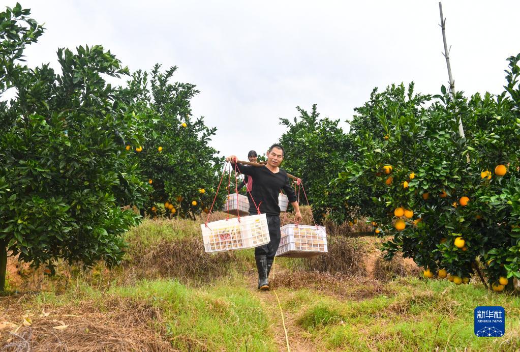 11月26日,在信豐縣安西鎮一家果園內,果農在挑運臍橙。
