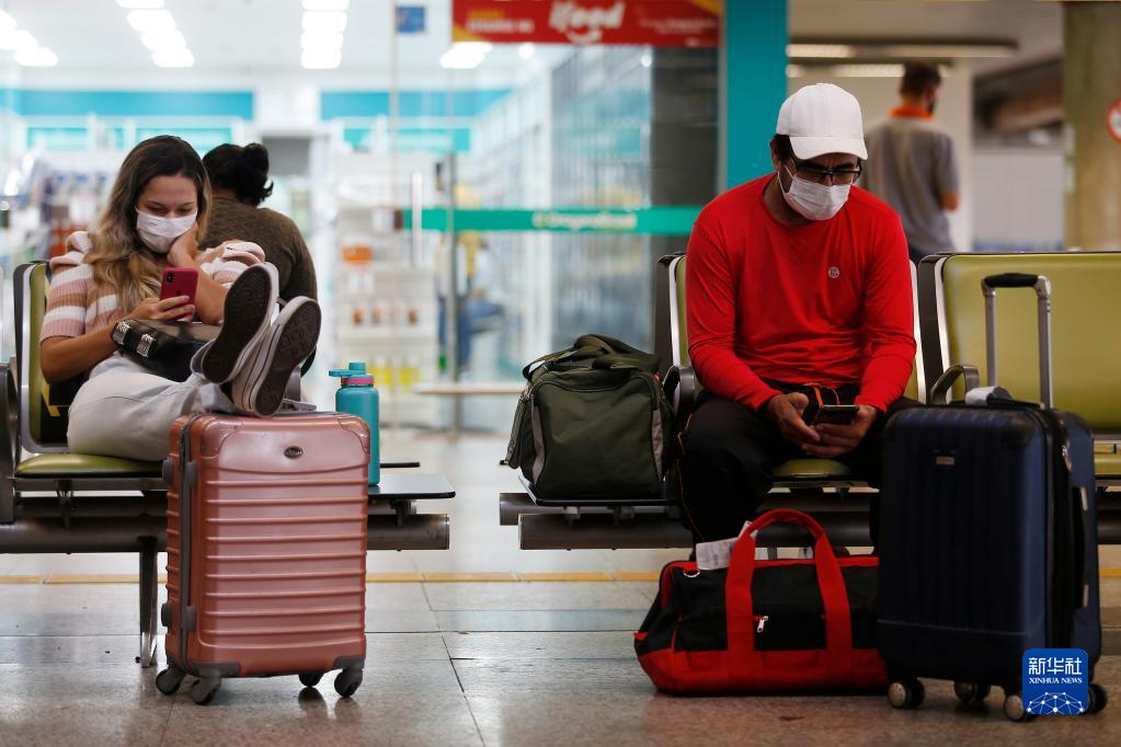 這是11月26日在巴西首都巴西利亞國際機場(chǎng)拍攝的戴口罩出行的旅客。