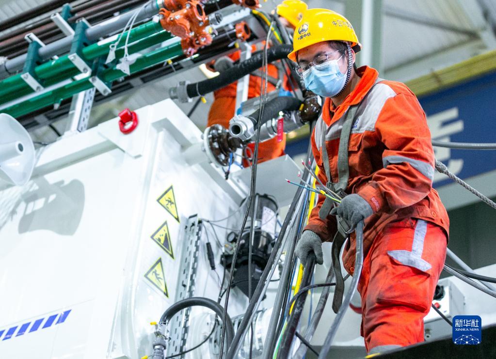 11月24日,工人在中鐵裝備集團車(chē)間內進(jìn)行掘進(jìn)機拖車(chē)管線(xiàn)拆除作業(yè),以便出口運輸。