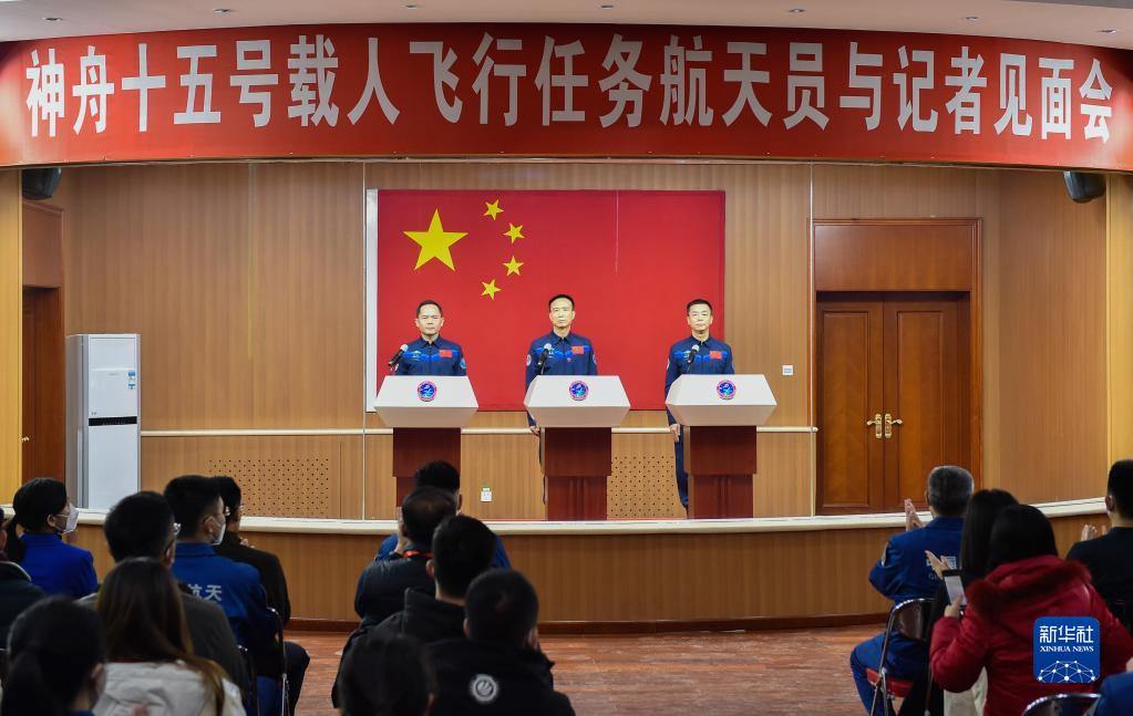 11月28日,執行神舟十五號載人飛行任務(wù)的航天員乘組費俊龍(中)、鄧清明(右)、張陸在酒泉衛星發(fā)射中心問(wèn)天閣與中外媒體記者集體見(jiàn)面,并回答記者提問(wèn)。