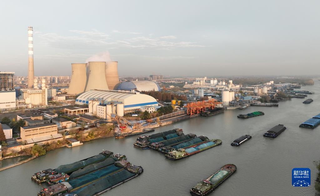 11月28日,運輸電煤的船舶經(jīng)過(guò)京杭大運河揚州段(無(wú)人機照片)。
