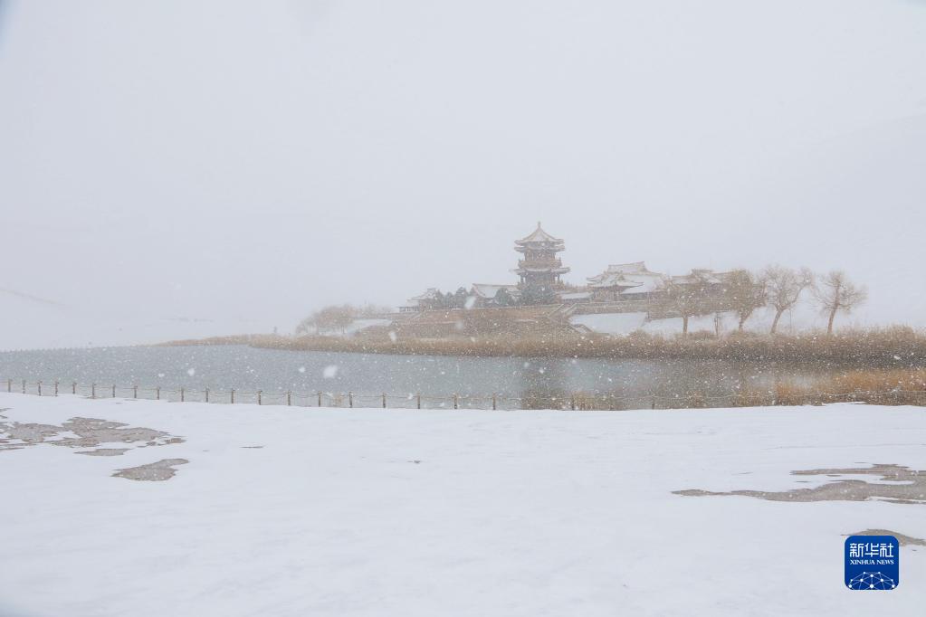 當日,甘肅敦煌迎來(lái)降雪。當地著(zhù)名景點(diǎn)鳴沙山月牙泉銀裝素裹、分外迷人。