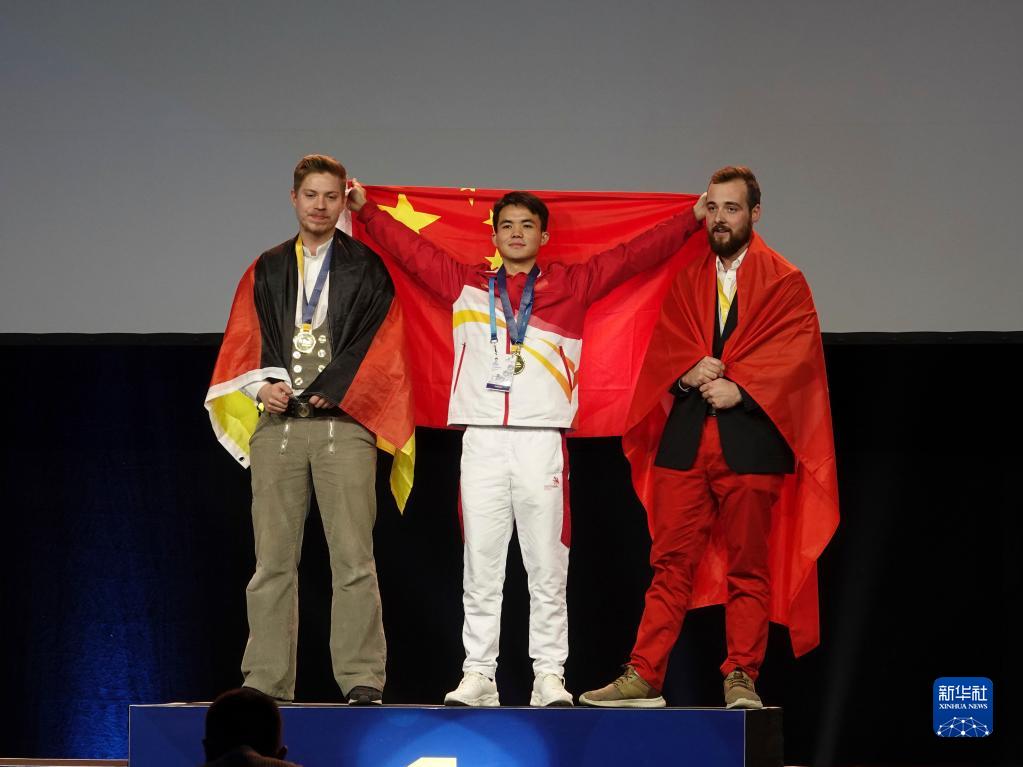 11月27日,在奧地利薩爾茨堡舉行的2022年世界技能大賽特別賽奧地利賽區閉幕式上,獲得砌筑項目金牌的中國選手伍遠州(中)在頒獎儀式上。
