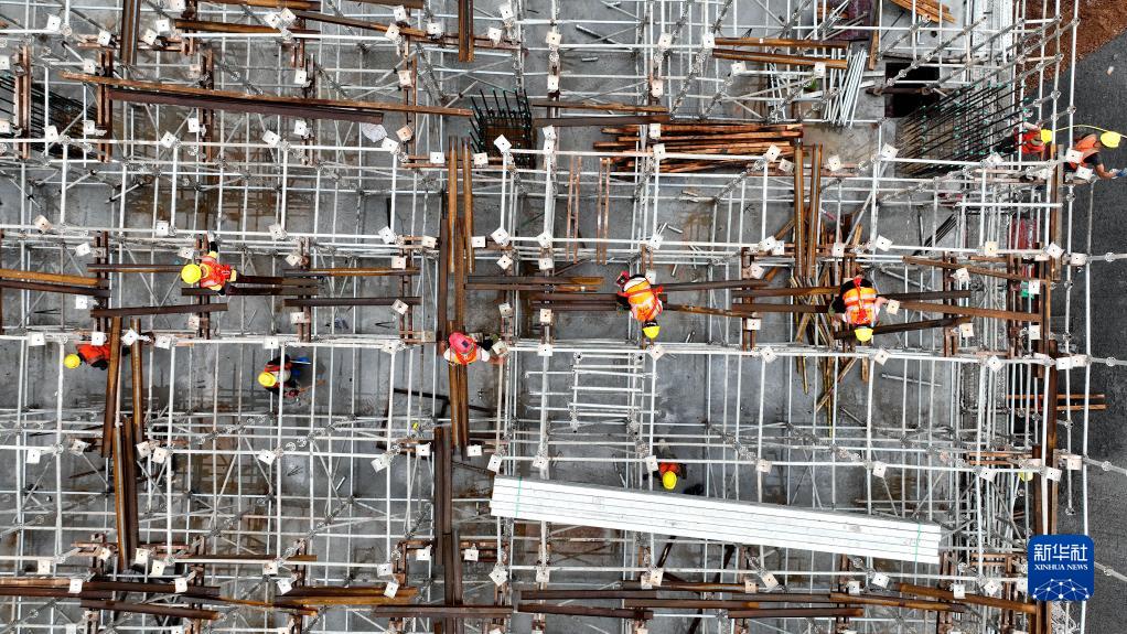 這是中鐵十一局的工人在玉林北站工地搭建鋼筋(11月26日攝,無(wú)人機照片)。
