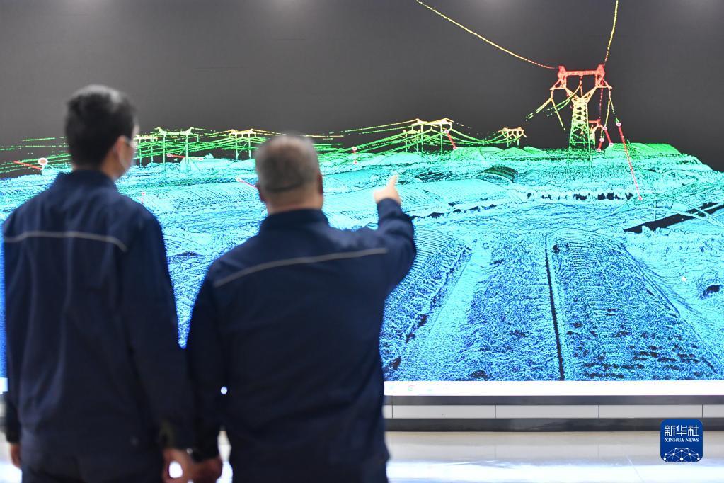 11月27日,于洋(右)與同事在智能巡檢中心查看三維立體地形地貌圖像。