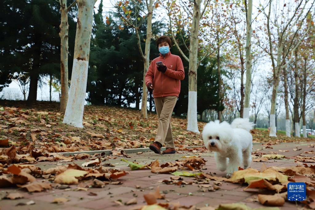 11月28日,山東省青島西海岸新區,市民在落滿(mǎn)樹(shù)葉的道路上行走。