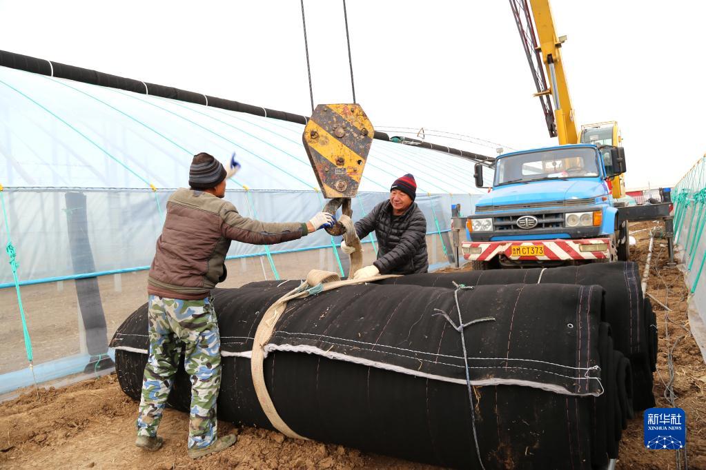 11月29日,山東省濱州市惠民縣淄角鎮農民操作大型機械給蔬菜大棚加蓋棉苫。