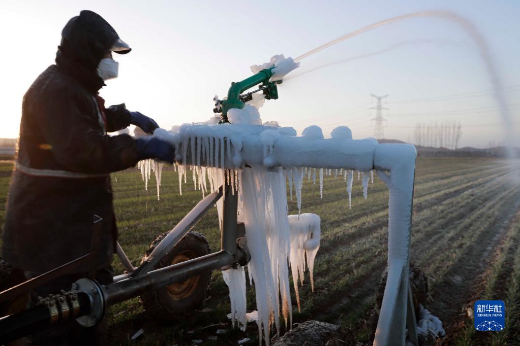 11月29日,河北省遵化市東新莊鎮西梁子河村的農民在操作噴灌機給小麥澆水。