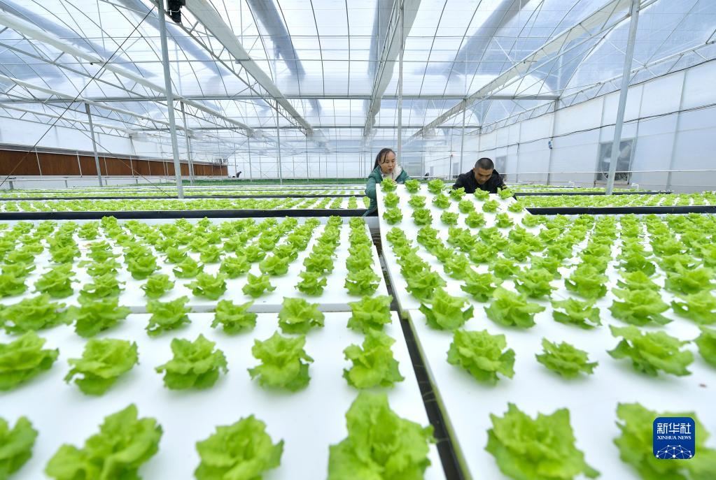 11月29日,宣恩縣椒園鎮鑼圈巖村的農民在溫控大棚里檢查水培蔬菜的生長(cháng)情況。