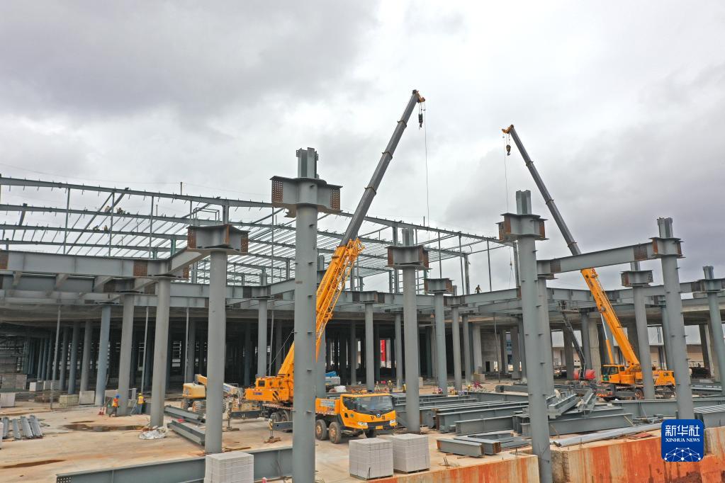 施工車(chē)輛在中新南寧國際物流園的電商物流園進(jìn)行頂棚施工(11月29日攝,無(wú)人機照片)。