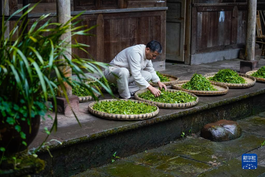 在四川省雅安市名山區的張氏祖屋,張躍華用傳統方式攤晾新采摘的鮮葉(2022年3月31日攝)。蒙山茶產(chǎn)于四川省雅安市名山區境內的蒙頂山,是綠茶的一種。張躍華,生于1959年,是國家級非物質(zhì)文化遺產(chǎn)代表性項目——綠茶制作技藝(蒙山茶傳統制作技藝)的代表性傳承人。張躍華自幼隨父親學(xué)習蒙山茶傳統制作技藝,是“張氏甘露”第五代傳人,他每年都要招收年輕徒弟,希望蒙山茶傳統制作技藝能世世代代傳承下去。