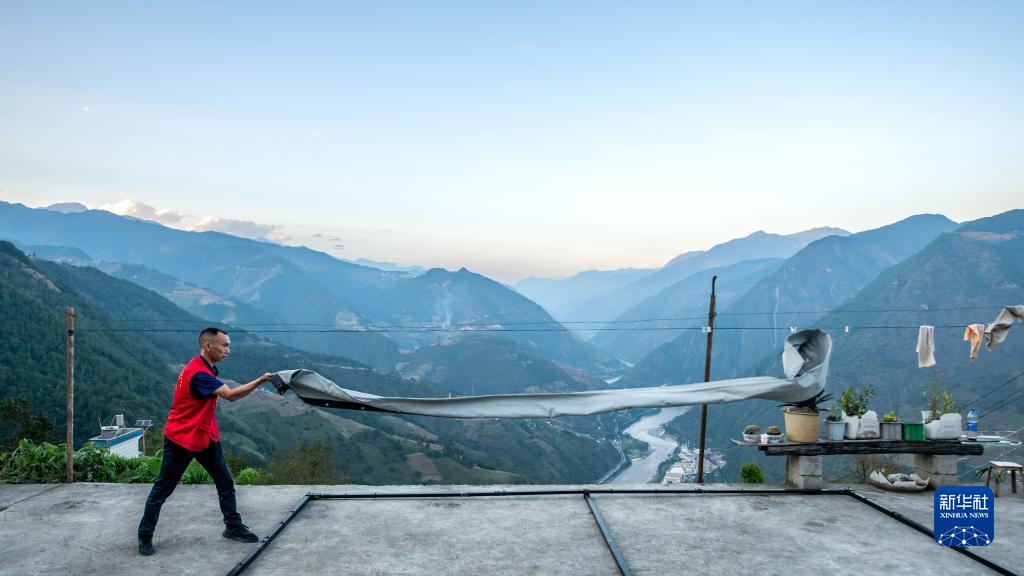 在怒江州瀘水市魯掌鎮登梗村,楊明金甩開(kāi)幕布(2022年10月21日攝)。