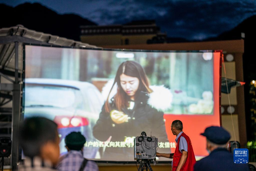 楊明金在怒江州瀘水市一個(gè)搬遷點(diǎn)播放科教片(2022年10月23日攝)。
