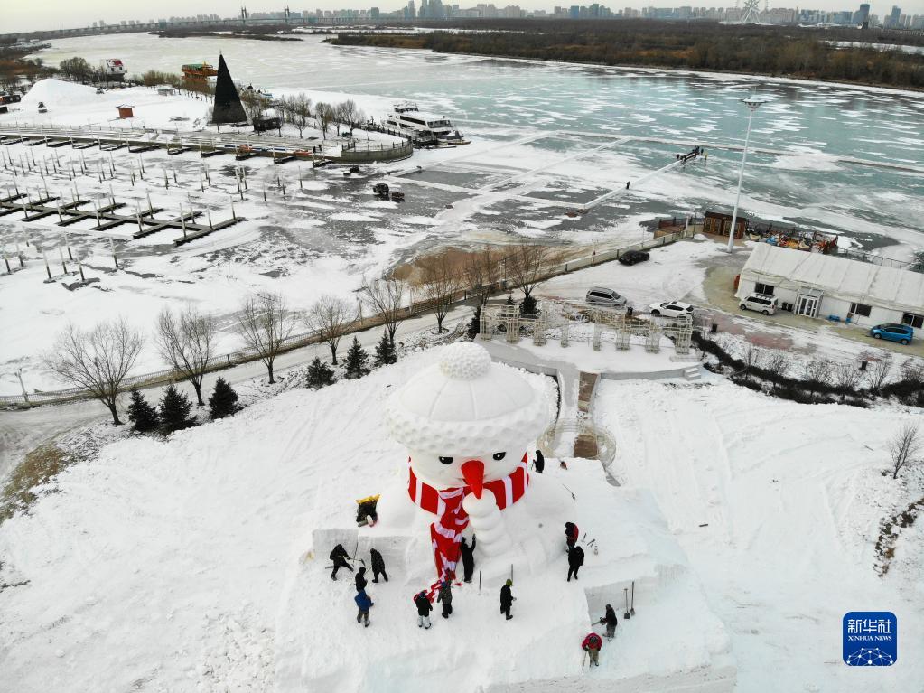 12月6日,工人在松花江哈爾濱段江畔搭建巨型雪人(無(wú)人機照片)。