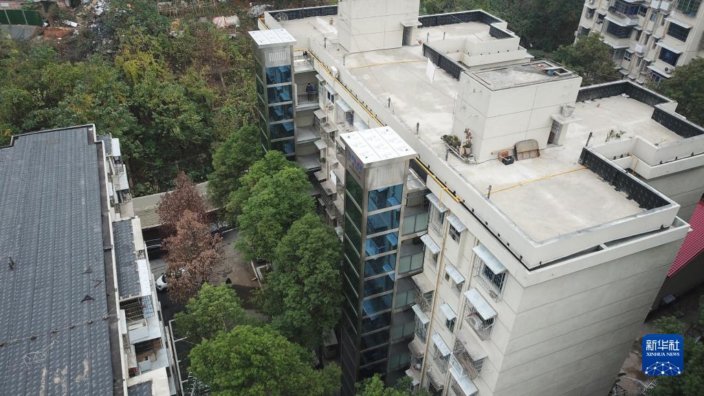 12月7日拍攝的長(cháng)沙市天心區裕南街街道長(cháng)坡社區木材廠(chǎng)宿舍兩部待完工的外掛式電梯(無(wú)人機照片)。