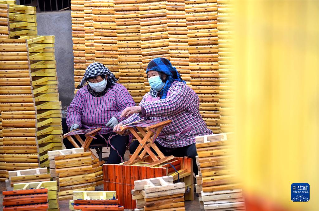 12月6日,山東省淄博市沂源縣石橋鎮馬莊村的村民在加工馬扎。