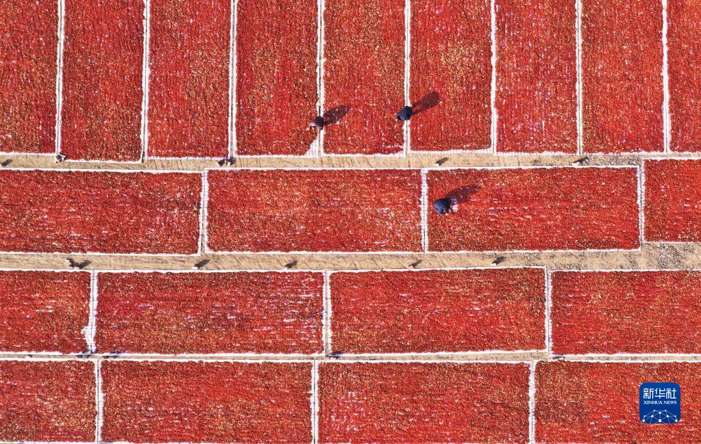 12月7日,在安徽省亳州市譙城區華佗鎮黃莊村,藥農在晾曬中藥材梔子(無(wú)人機照片)。