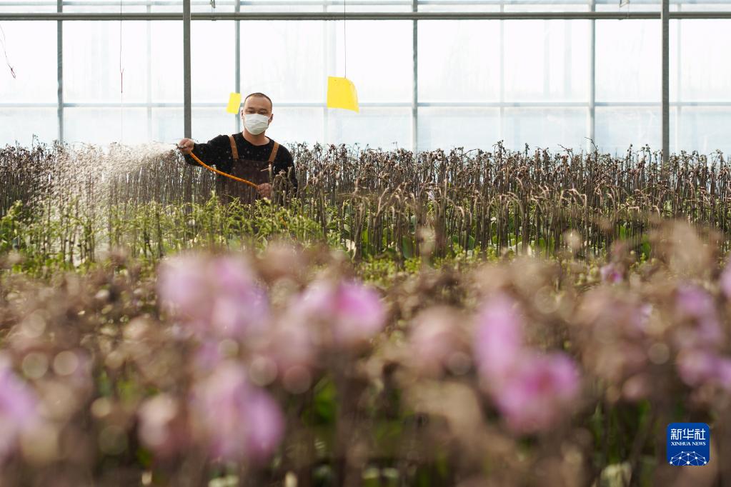 12月7日,河北省邢臺市內丘縣一處農業(yè)生態(tài)園的員工在溫室大棚里管護蝴蝶蘭。