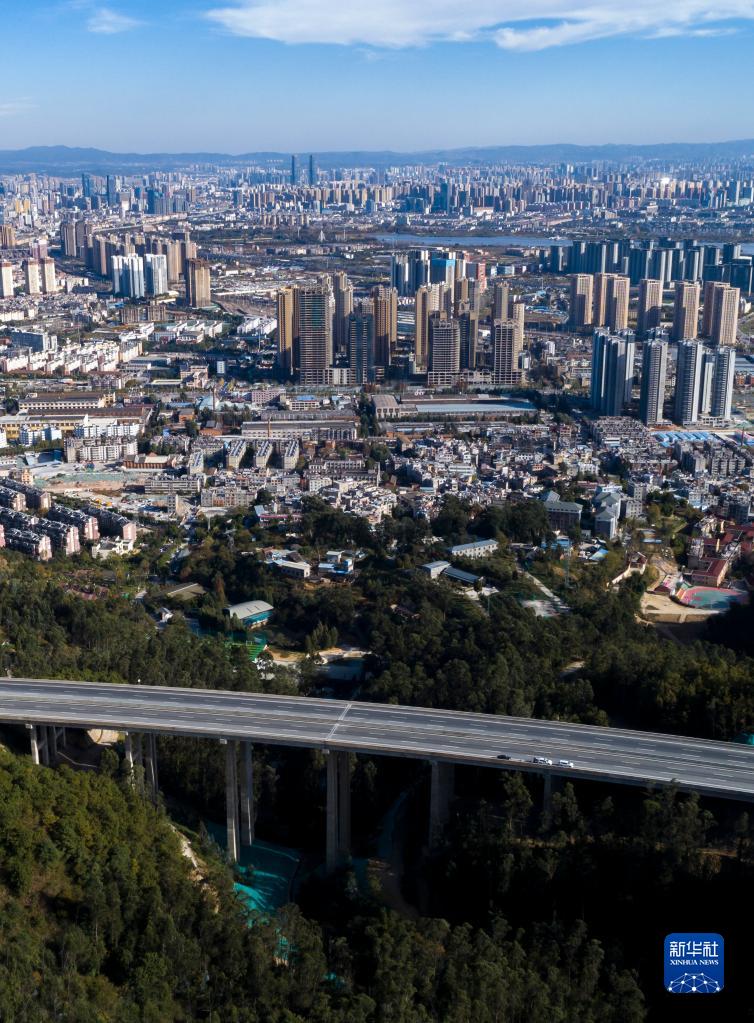 這是12月8日拍攝的新昆楚高速昆明入城段一景,遠處是昆明主城區(無(wú)人機照片)。新華社記者 陳欣波 攝