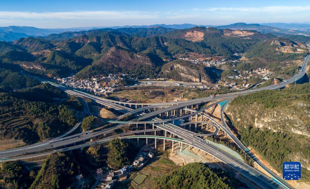 這是12月8日拍攝的新昆楚高速昆明西北繞城樞紐立交,左上到右下是新昆楚高速,左下到右上是昆明繞城高速(無(wú)人機照片)。新華社記者 陳欣波 攝