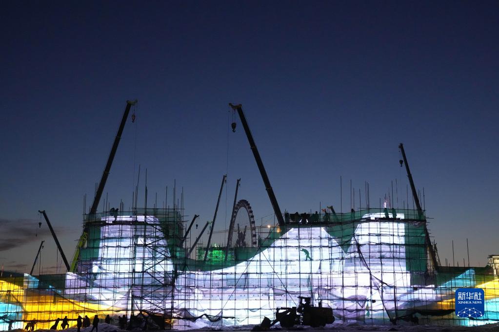 12月7日,工人在哈爾濱一處冰雪景觀(guān)建設現場(chǎng)施工。