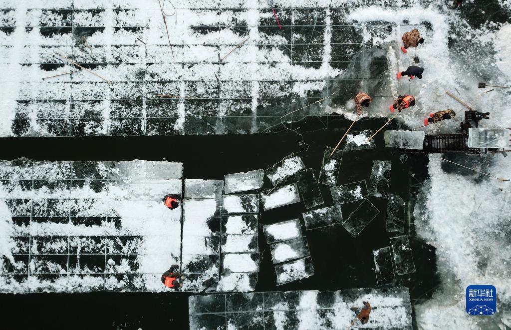 12月7日,工人在松花江哈爾濱段冰封的江面上進(jìn)行采冰作業(yè)(無(wú)人機照片)。