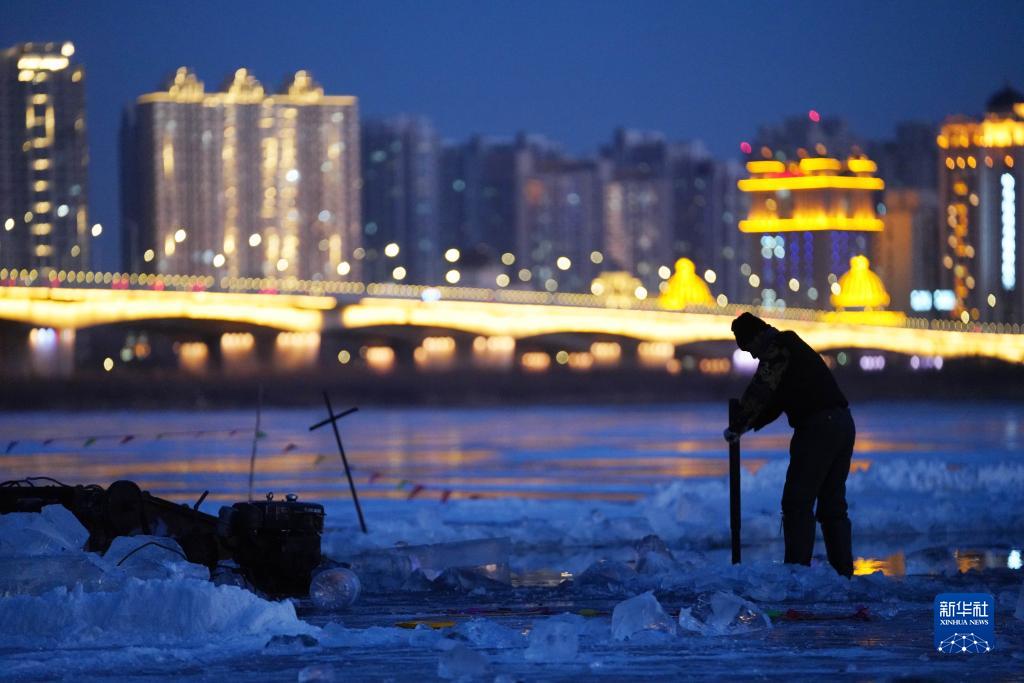 12月7日,工人在松花江哈爾濱段冰封的江面上進(jìn)行采冰作業(yè)。