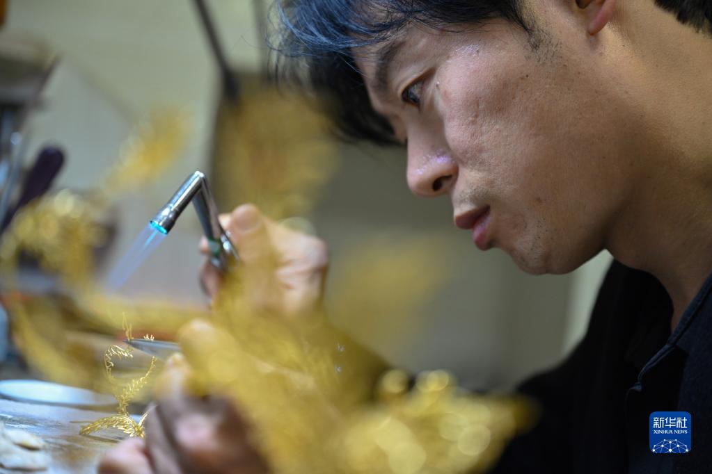 12月8日,創(chuàng )業(yè)青年黃飛達在上塘村的個(gè)人手工作坊內用噴槍燒熔鍍金銀器。