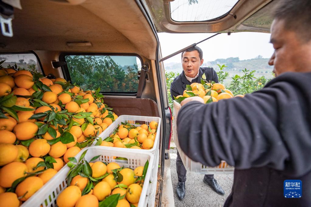 12月9日,在重慶市璧山區廣普鎮坪中村,璧山區人大代表文勇(左)幫助水果商販將收購的臍橙搬運上車(chē)。