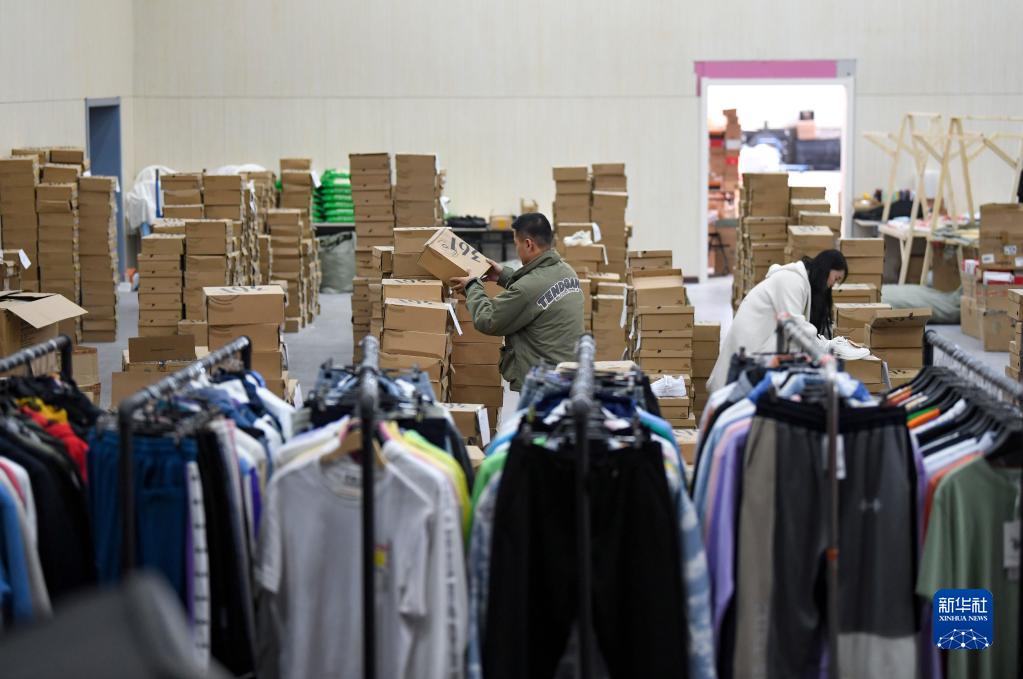 12月9日,工作人員在獅城寧好電商網(wǎng)批(西部)運營(yíng)基地倉庫搬運貨物。