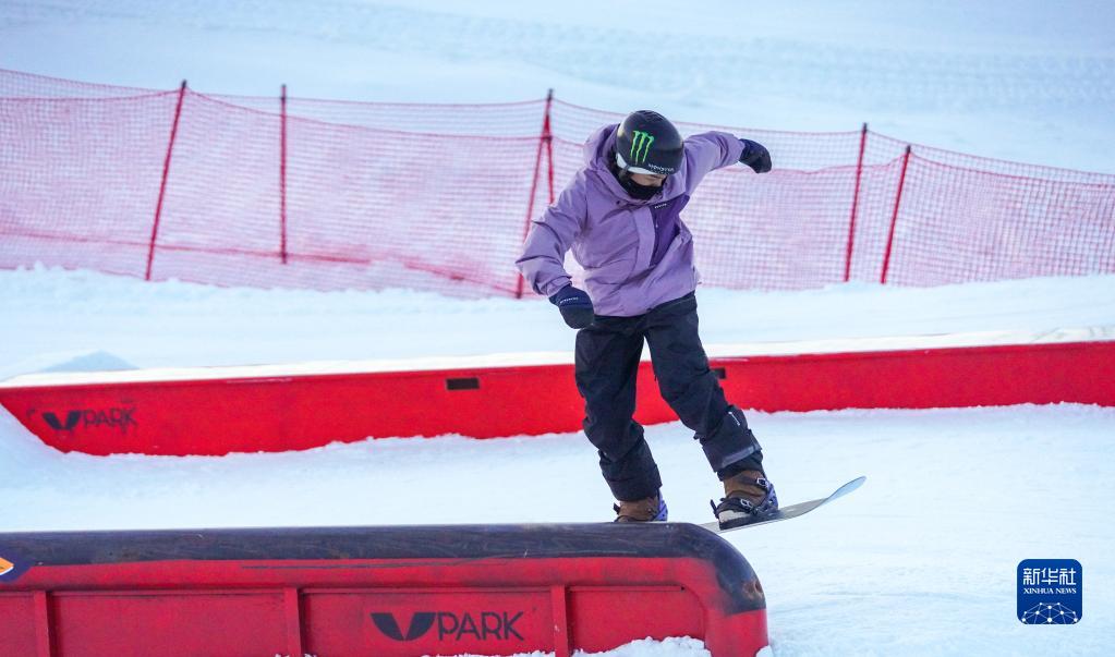 北京冬奧會(huì )單板滑雪男子大跳臺冠軍蘇翊鳴在V-PARK地形公園挑戰場(chǎng)地道具(12月10日攝)。