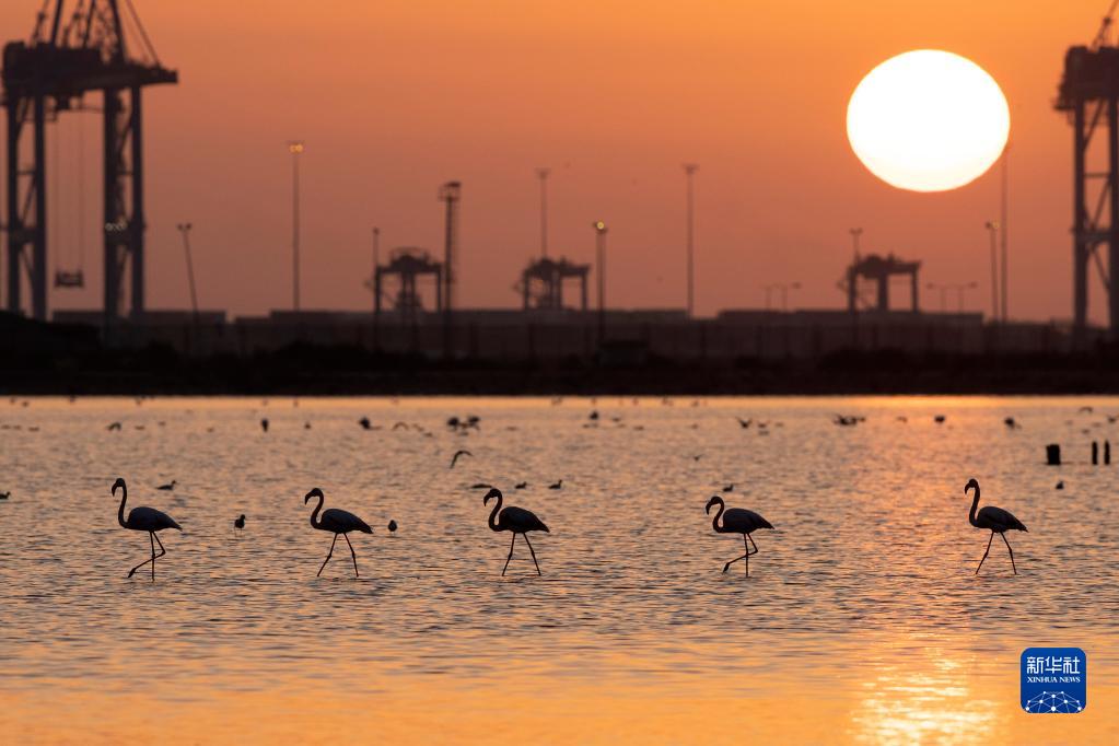這是12月12日在埃及塞得港省福阿德港自然保護區拍攝的火烈鳥(niǎo)。