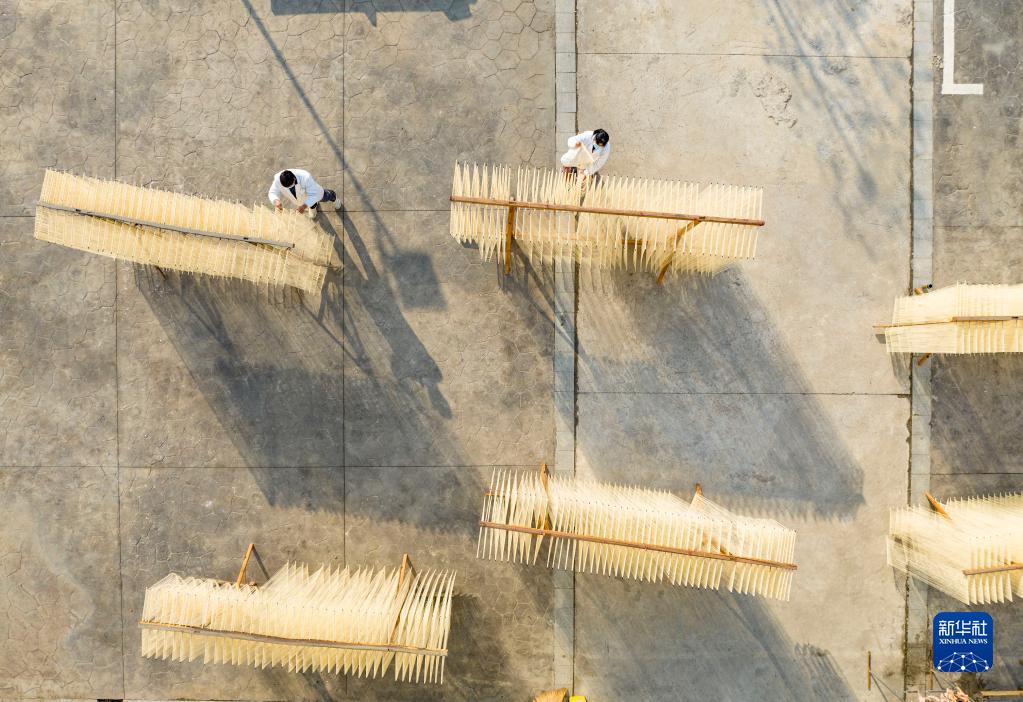 12月12日,在竹塘社區掛面合作社的掛面車(chē)間,工人在將掛面上架晾曬(無(wú)人機照片)。