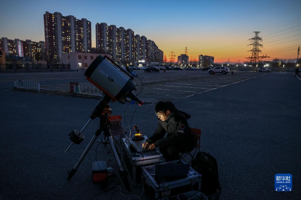 12月4日,在北京昌平一處拍攝地,劉博洋調試追蹤拍攝設備,計劃拍攝即將返回地球的神舟十四號載人飛船。