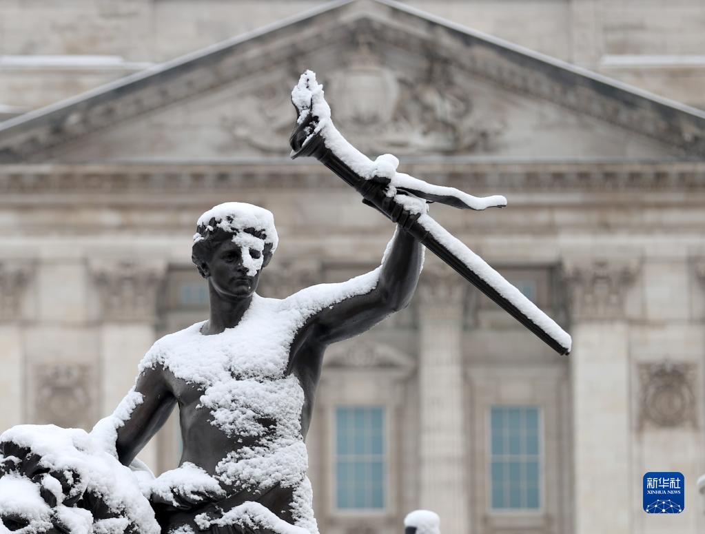12月12日,英國倫敦白金漢宮前的雕塑被積雪覆蓋。