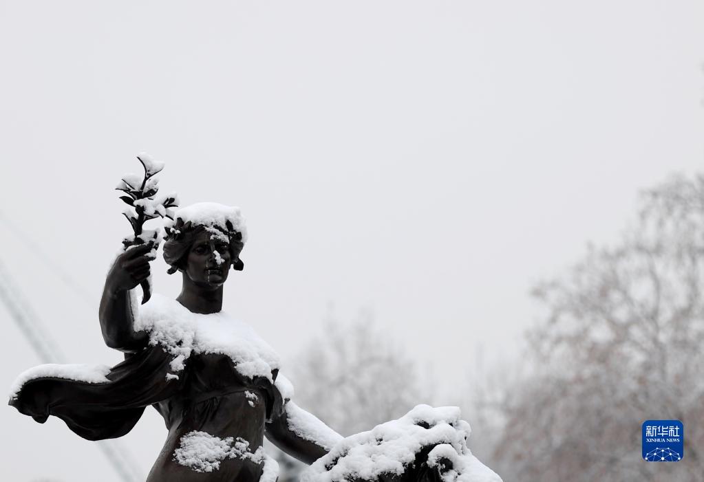 12月12日,英國倫敦白金漢宮前的雕塑被積雪覆蓋。