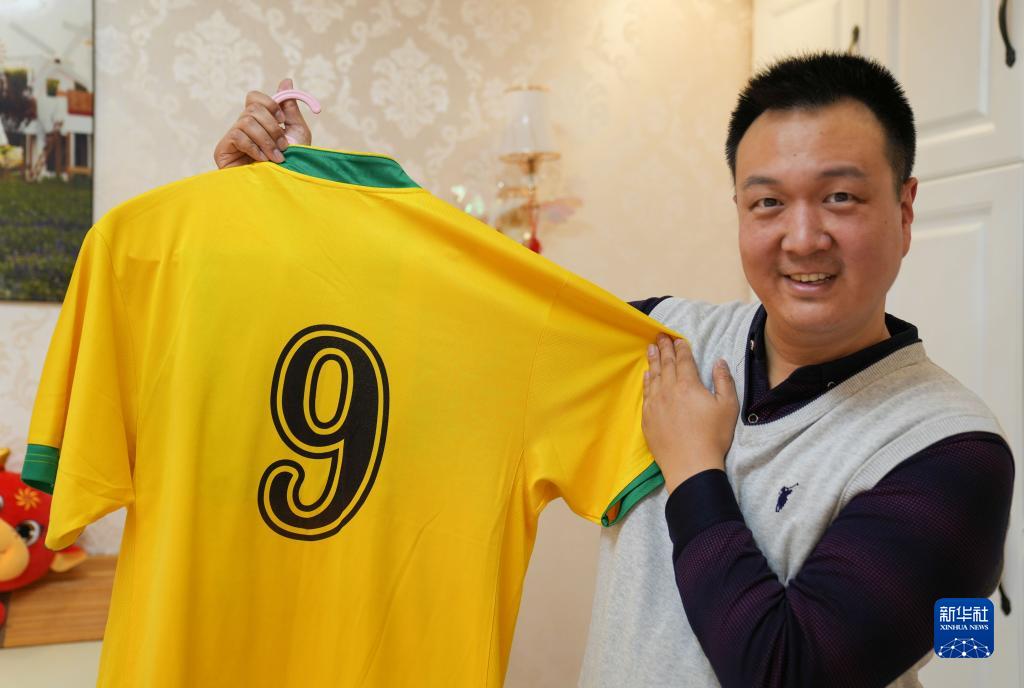 蔡成在家中展示他12歲時(shí)的生日禮物:一件巴西球員羅納爾多的9號球衣(12月1日攝)。