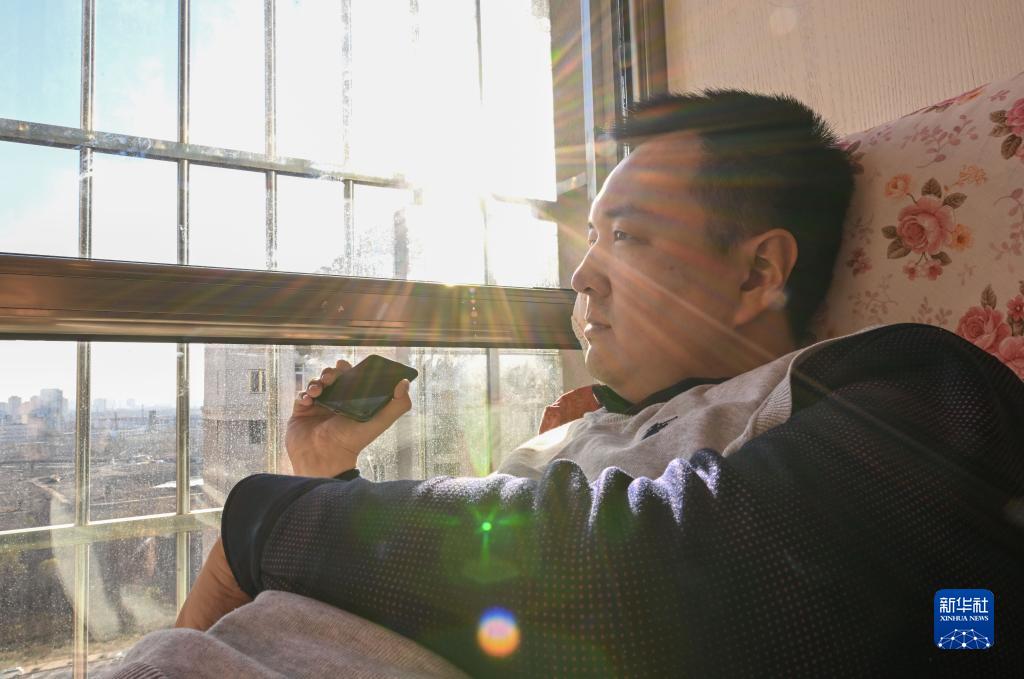 蔡成通過(guò)智能手機收聽(tīng)卡塔爾世界杯一場(chǎng)小組賽的賽后解說(shuō)(12月1日攝)。