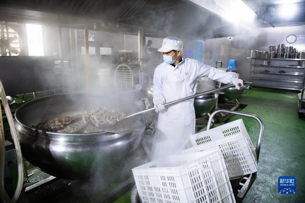 12月13日,在湖南彭記坊農業(yè)科技發(fā)展有限公司預制菜生產(chǎn)車(chē)間,工作人員在烹飪食材。