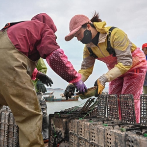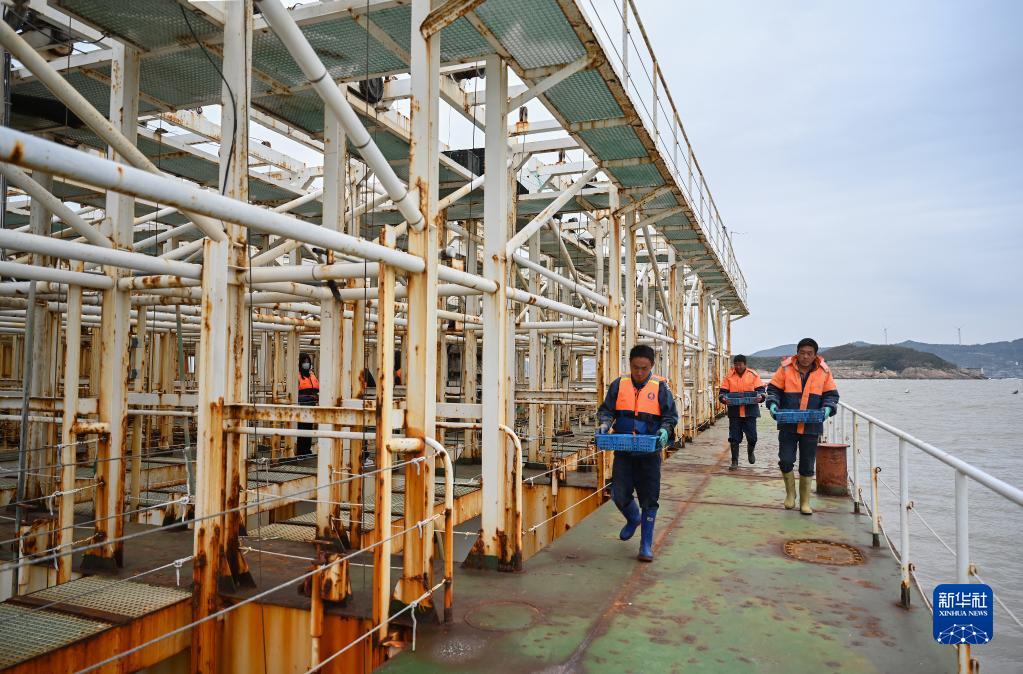 12月13日,漁民在連江縣深遠海鮑魚(yú)機械化養殖平臺“福鮑1號”上搬運鮑魚(yú)的食物龍須菜。