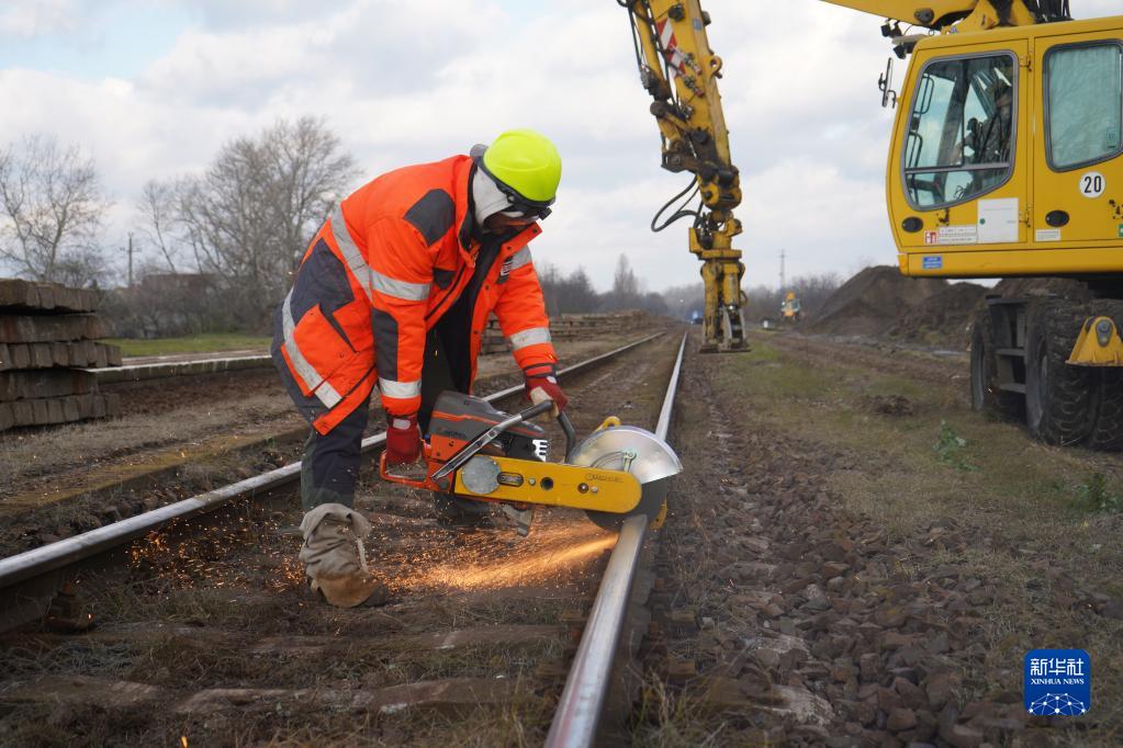12月12日,在匈牙利陶克紹尼,一名工人在匈塞鐵路匈牙利段施工現場(chǎng)切割舊鐵軌。