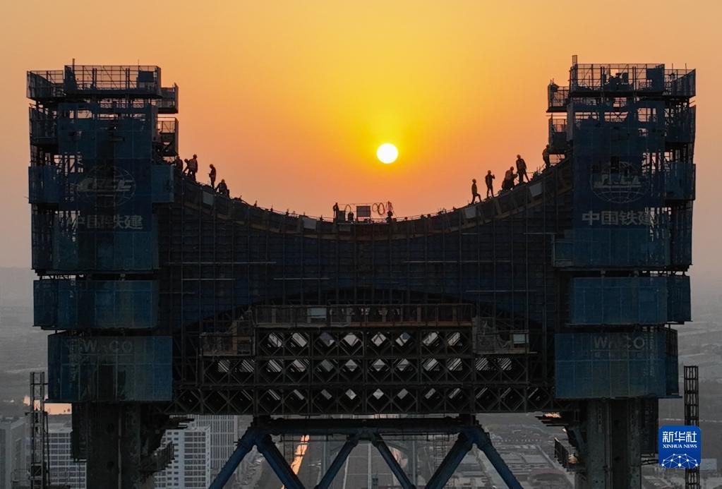 12月14日,工人在跨襄陽(yáng)北編組站大橋T3主塔上施工(無(wú)人機照片)。