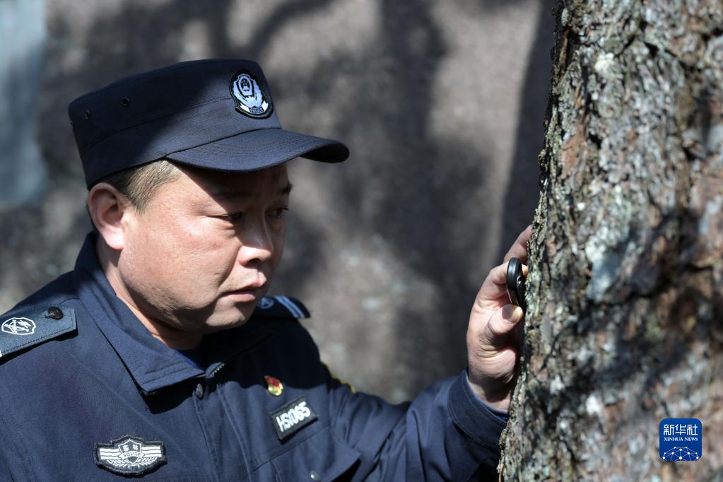 12月12日,胡曉春用放大鏡檢查迎客松的樹(shù)皮和紋理,以便及時(shí)發(fā)現病蟲(chóng)害。