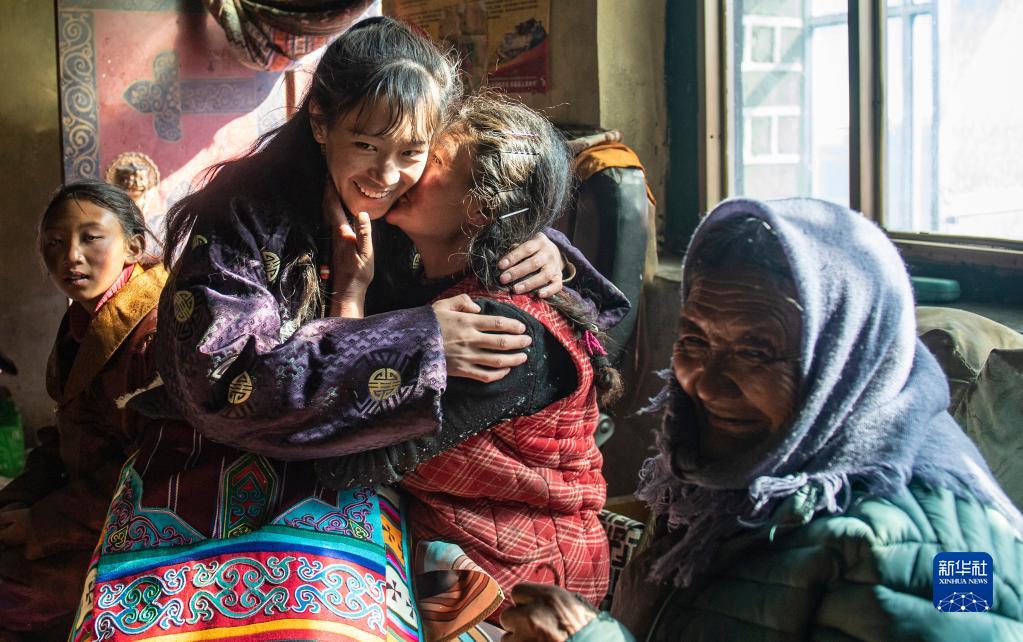 這是1月18日,在西藏當雄縣納措鄉甲嘎村,放寒假回家的江蘇食品藥品職業(yè)技術(shù)學(xué)院中藥學(xué)專(zhuān)業(yè)大學(xué)生旦增卓瑪(左二)和母親邊卓說(shuō)悄悄話(huà)。
