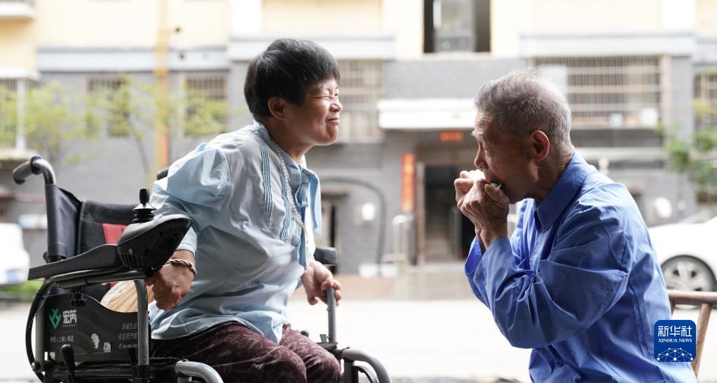 這是6月18日,在江西省新余市寶泰小區,72歲的廖斌晟為從小患有先天性腦癱、智力水平只相當于7歲兒童的女兒廖永紅吹奏口琴。