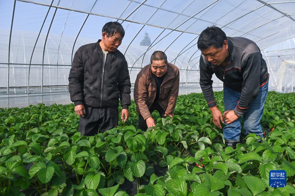12月15日,在建德市乾潭鎮的草莓產(chǎn)業(yè)“共富工坊”大棚內,草莓種植大戶(hù)仇小明(中)指導種植戶(hù)注意溫度和濕度變化。