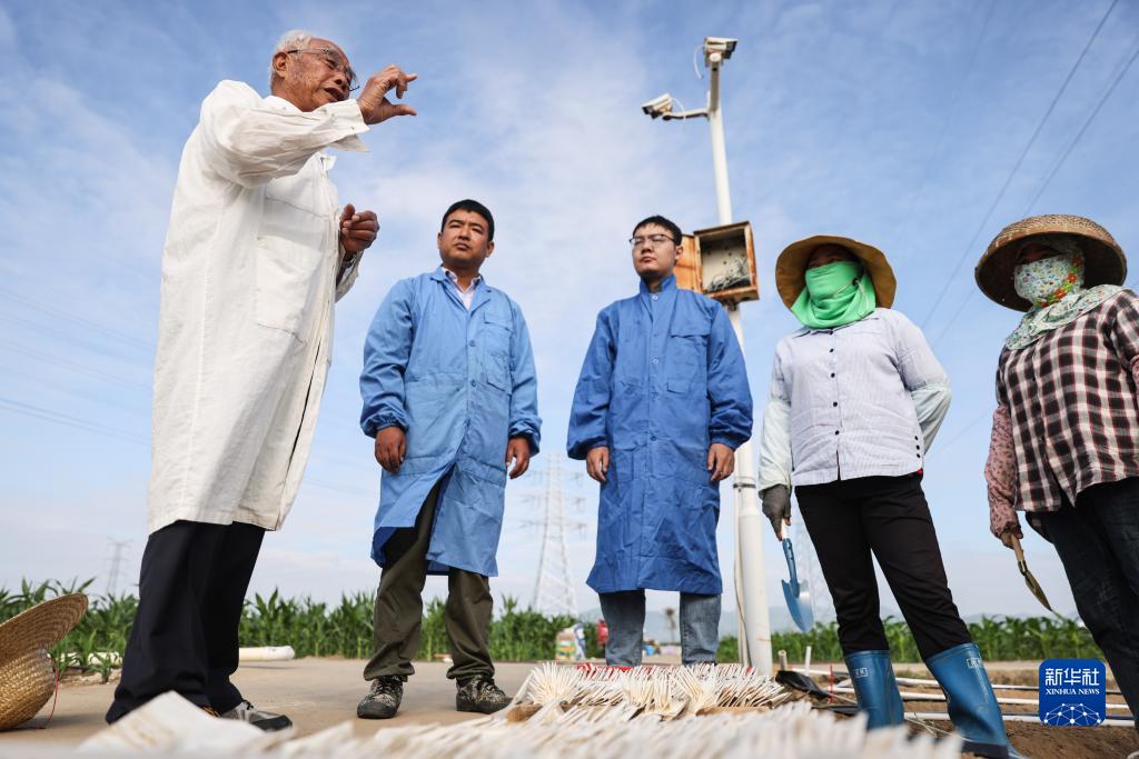 12月15日,玉米育種專(zhuān)家程相文(左一)在三亞南繁科研育種基地指導工人播種。