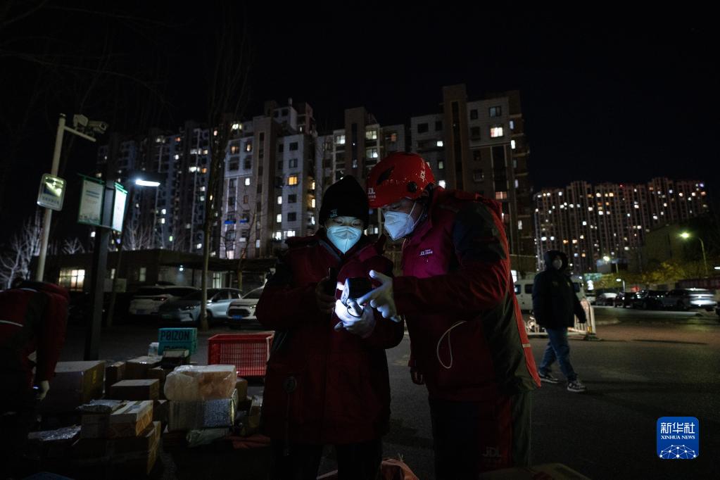 在北京市大興區新源時(shí)代小區,從西安赴京支援的快遞小哥齊帥龍(右)和高興興在核查配送信息(12月15日攝)。