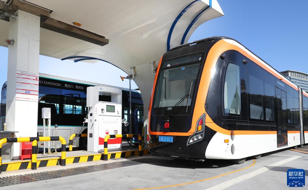 12月15日,一輛氫能中運量公交車(chē)駛入氫能公交車(chē)加氣站加氣。